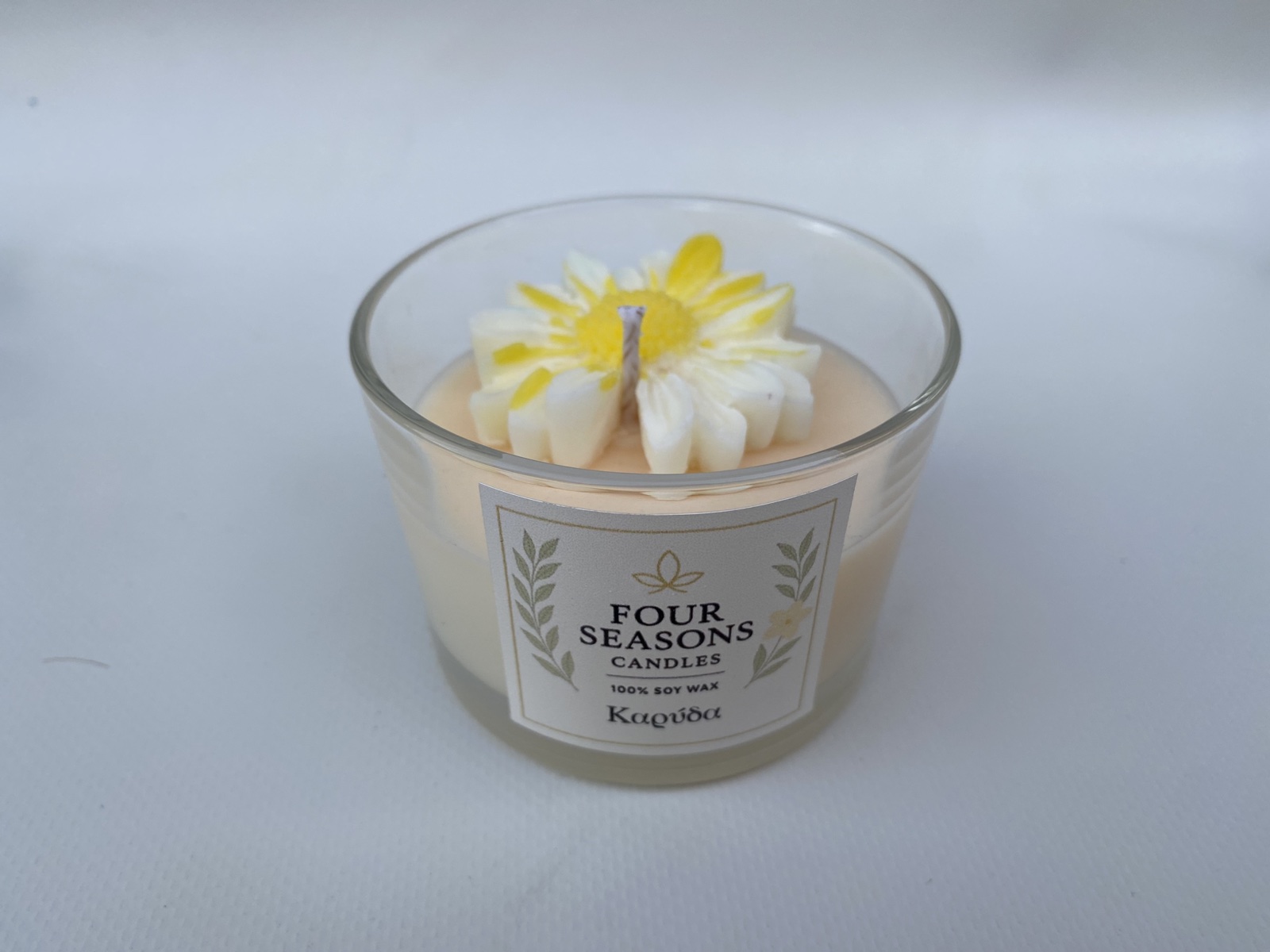 Αρωματικό κερί σόγιας σε γυάλινο ποτήρι, διακοσμημένο με χειροποίητο λουλούδι στην κορυφή. Με άρωμα Καρύδα που γεμίζει τον χώρο με γλυκιά και ζεστή αίσθηση.