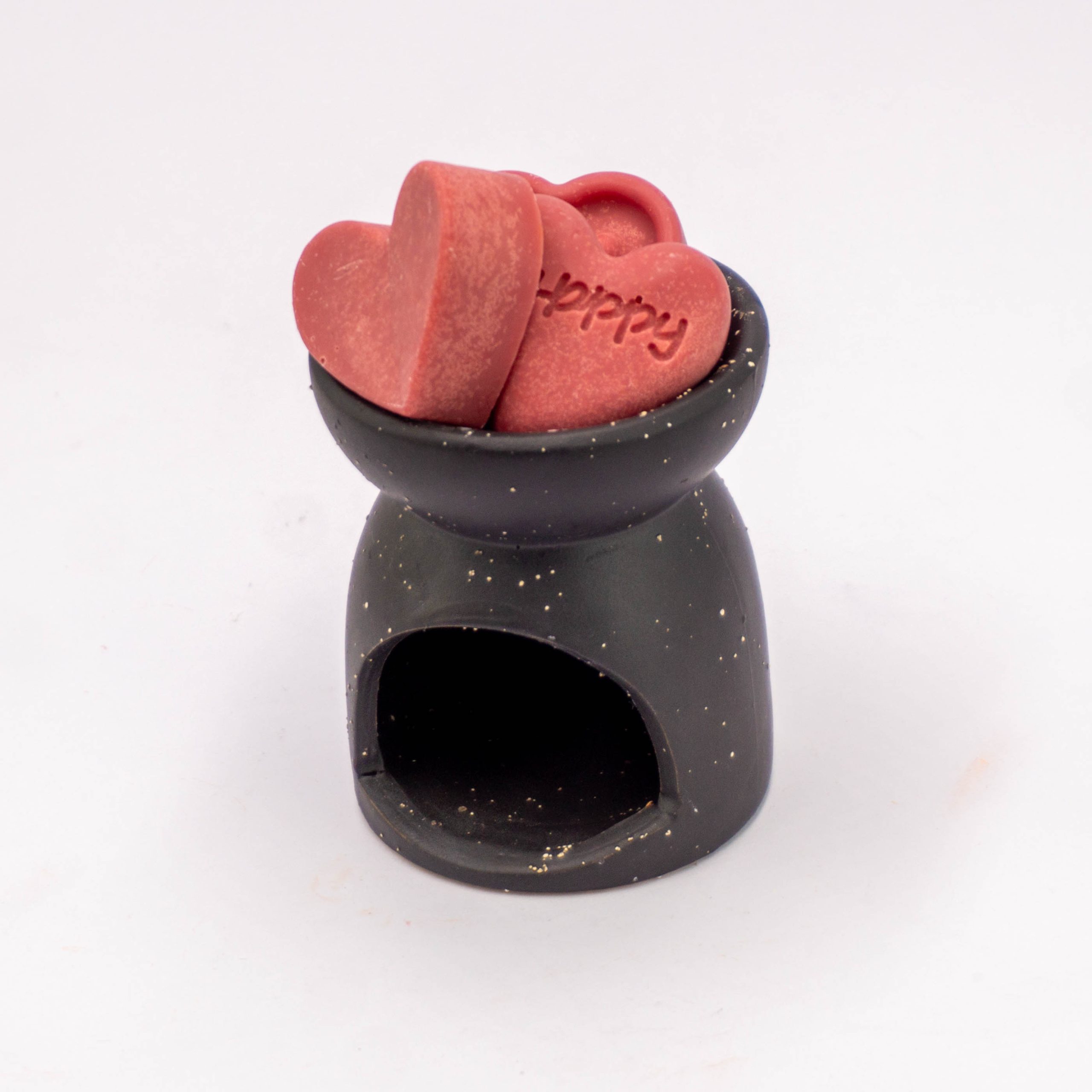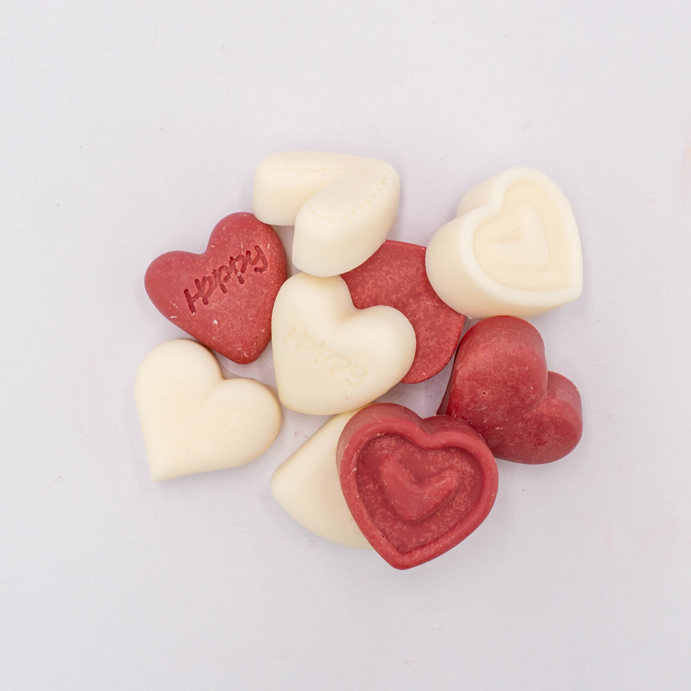 Χειροποίητα wax melts σε σχήμα καρδιάς, σε κόκκινο και λευκό χρώμα, φτιαγμένα από φυτικό κερί σόγιας για καθαρή και μακράς διάρκειας απόδοση αρώματος.